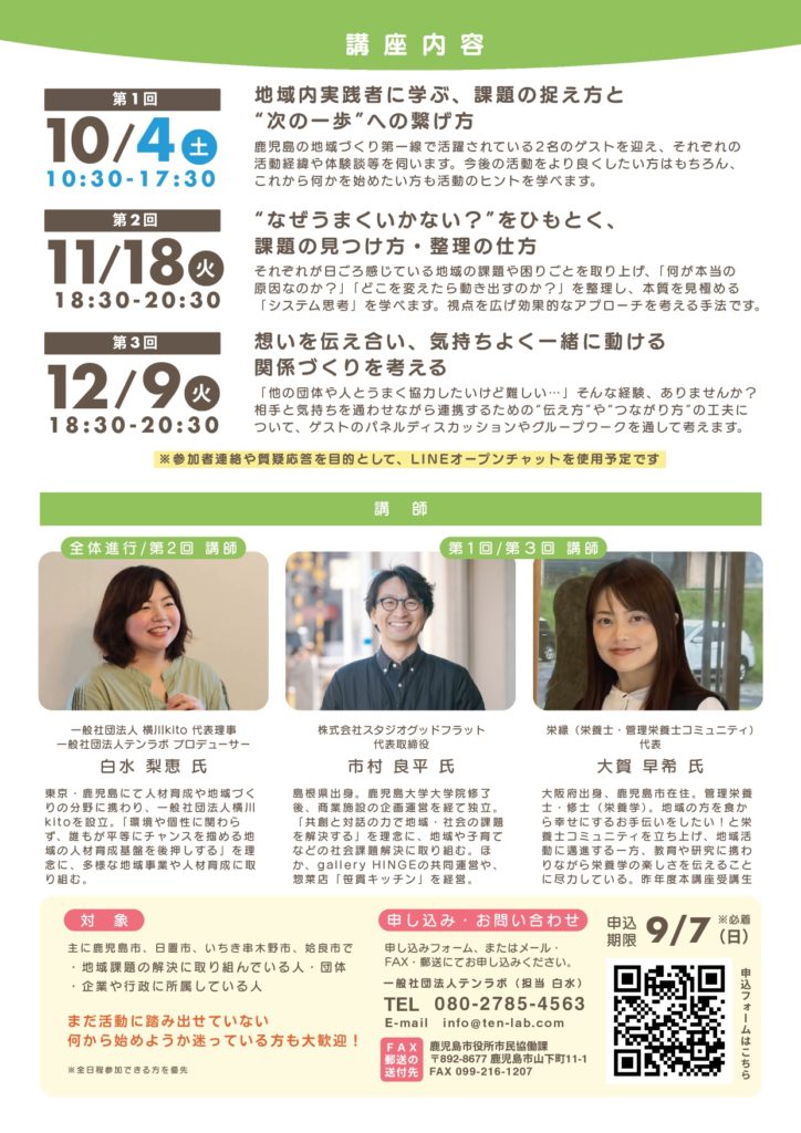内容:鹿児島の地域づくり第一線で活躍されている2名のゲストを迎え、それぞれの活動経緯や体験談等を伺います。今後の活動をより良くしたい方はもちろん、これから何かを始めたい方も活動のヒントを学べます。