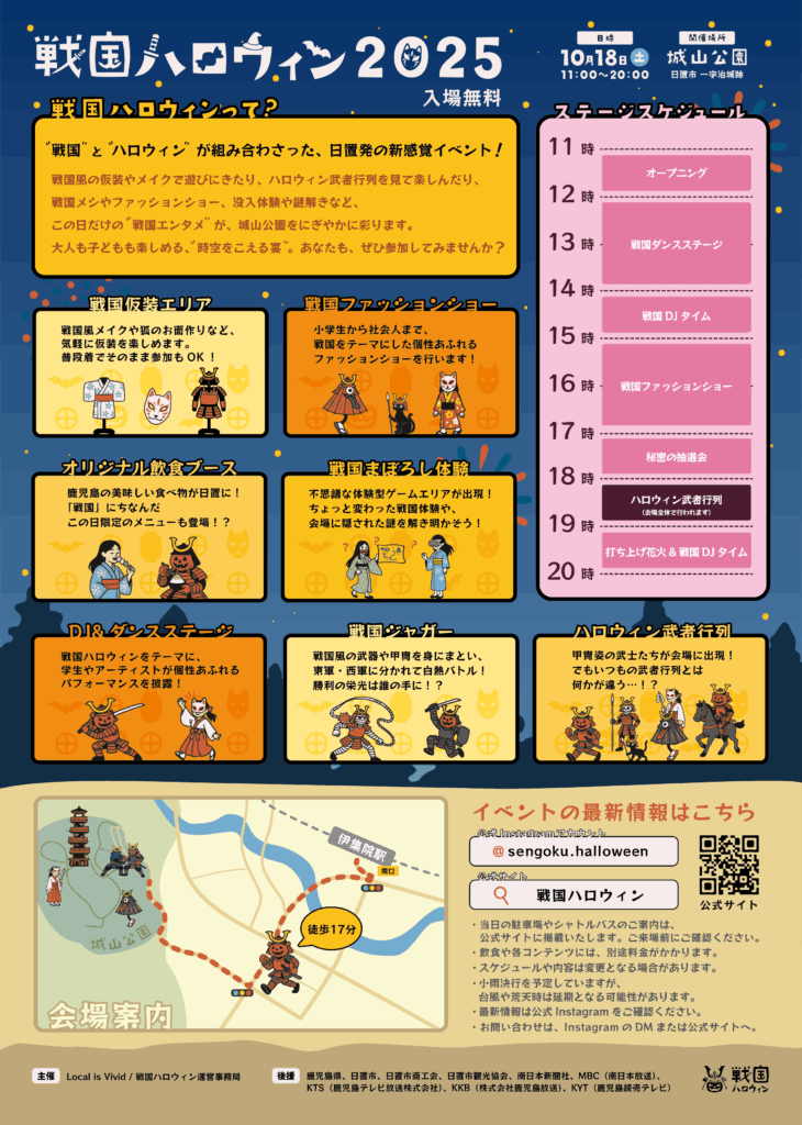 戦国風の仮装やメイクで遊びにきたり、ハロウィン武者行列を見て楽しんだり、戦国メシやファッションショー、投入体験や謎解きなど、この日だけの“戦国エンタメ”が、城山公園をにぎやかに彩ります。