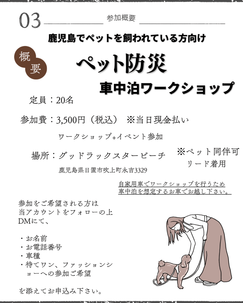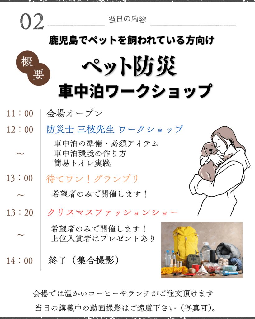 こうした背景を踏まえ、2025年12月21日、鹿児島にて防災士・三枝氏を講師に迎え「ペットと過ごす車中泊ワークショップ」を開催いたします!