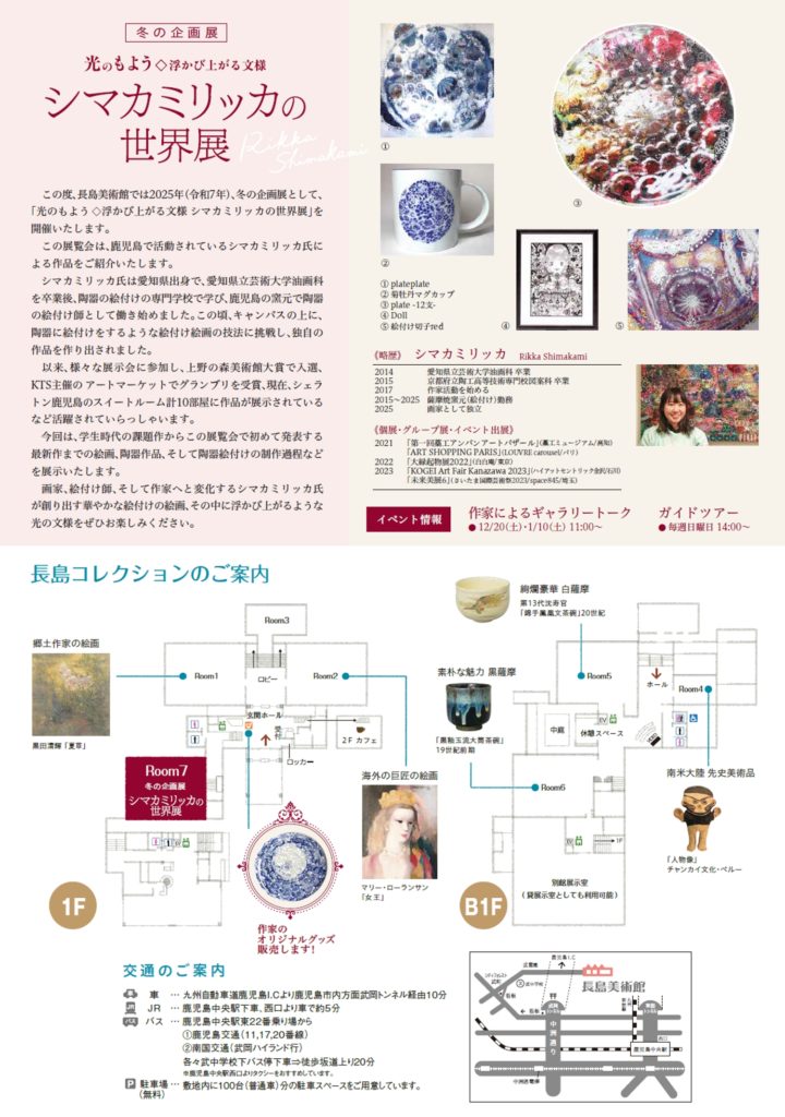この展覧会は、鹿児島で活動されているシマカミリッカ氏による作品をご紹介いたします。シマカミリッカ氏は愛知県出身で、愛知県立芸術大学油画科を卒業後、陶器の絵付けの専門学校で学び、鹿児島の窯元で陶器の絵付け師として働き始めました。この頃、キャンバスの上に、陶器に絵付けをするような絵付け絵画の技法に挑戦し、独自の作品を作り出されました。