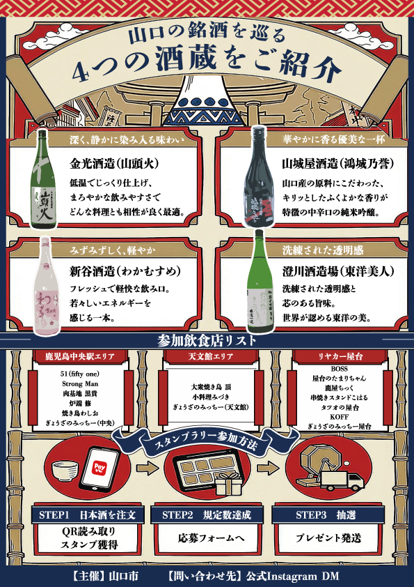 本キャンペーンでは、山口市・萩市の日本酒4蔵を鹿児島市内の飲食店および「かごしまリヤカー屋台」で飲み比べできるほか、鹿児島銀行のデジタル決済アプリ「PAYどん」を活用したデジタルスタンプラリーや、西郷隆盛や大久保利通、坂本龍馬なども訪れた山口市湯田温泉の老舗旅館・松田屋ホテルのペア宿泊券や特産品が当たるプレゼント企画を実施します。焼酎文化が根付く鹿児島で、日本酒を通じて薩長の歴史と交流を楽しめる新たな体験企画です。