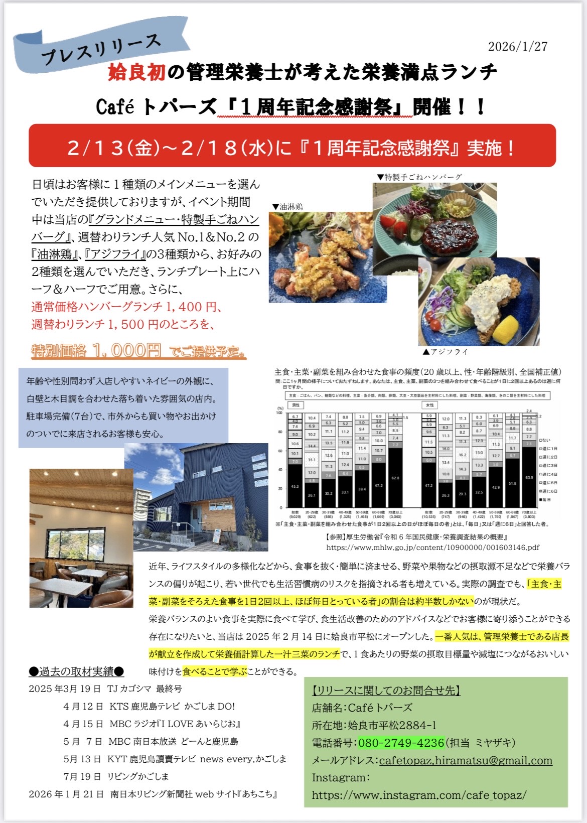 1周年を迎えるため、お客様や地域の皆様に感謝の気持ちを伝えるため、2月13日~2月18日に1周年限定の特別なランチをご用意いたします。
